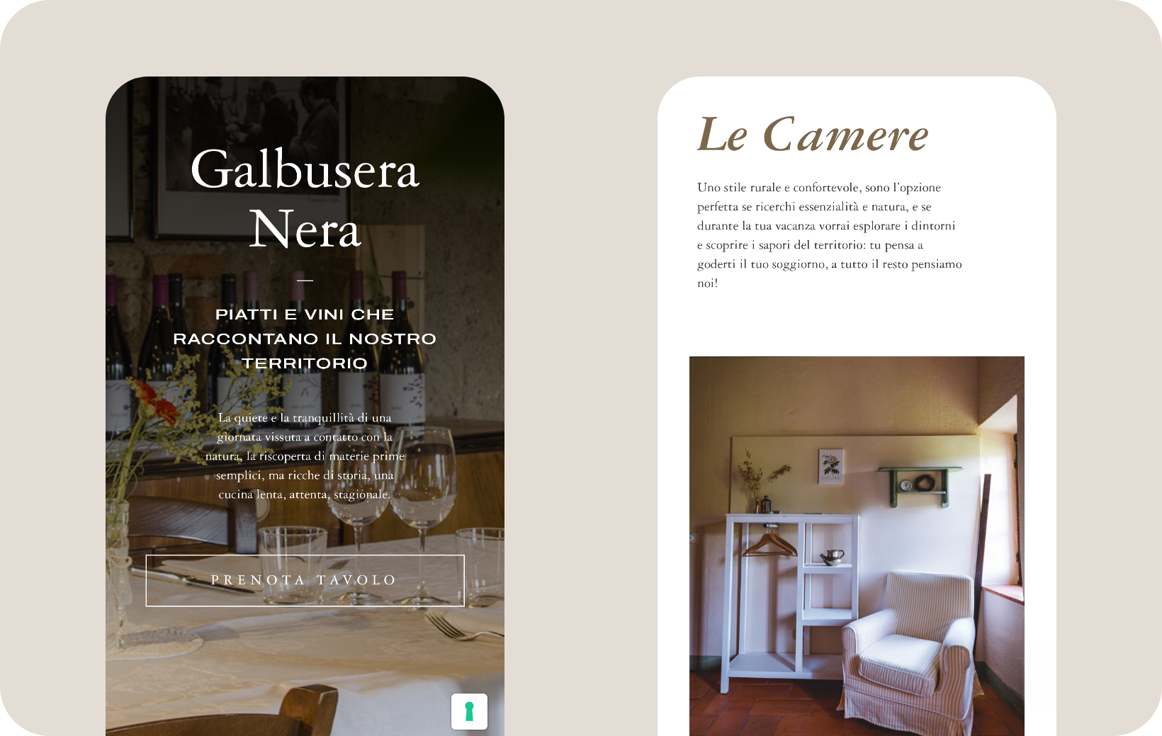 L’interfaccia utente è stata sviluppata con un design pulito e moderno, che rispecchia l’eleganza rustica dell’agriturismo. L’uso di immagini ad alta qualità delle camere e degli appartamenti, arredati con elementi di recupero e materiali naturali, tinteggiati con delicati colori pastello, permette agli utenti di immergersi nell’atmosfera accogliente della struttura. I font scelti e la disposizione degli elementi grafici contribuiscono a creare un’esperienza visiva coerente e rilassante.