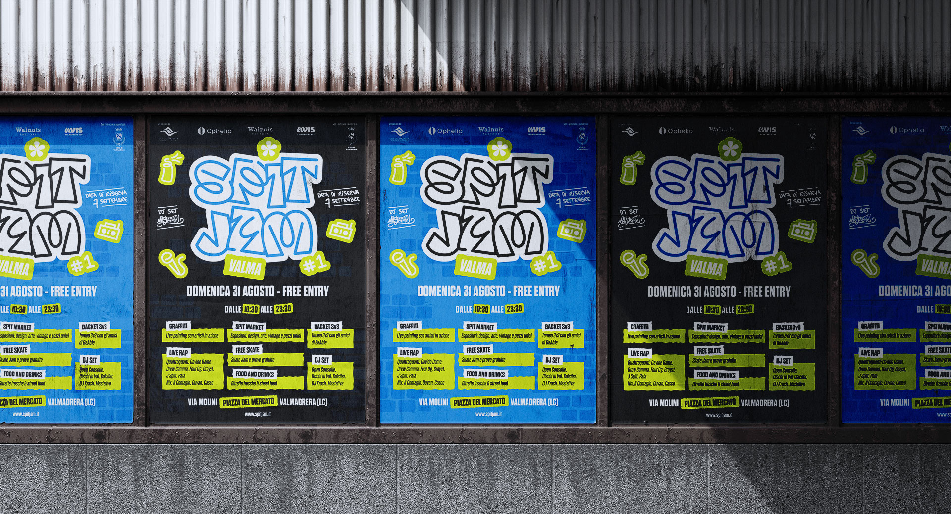 Abbiamo curato l’identità visiva e la comunicazione dell’intero evento con l’intento di dare voce a giovani talenti, favorire l’inclusione e valorizzare l’anima creativa della città. Spit Jam non rappresenta soltanto un momento di intrattenimento, ma un’occasione per rigenerare spazi pubblici e restituirli alla collettività come superfici che parlano, ispirano e uniscono generazioni diverse.