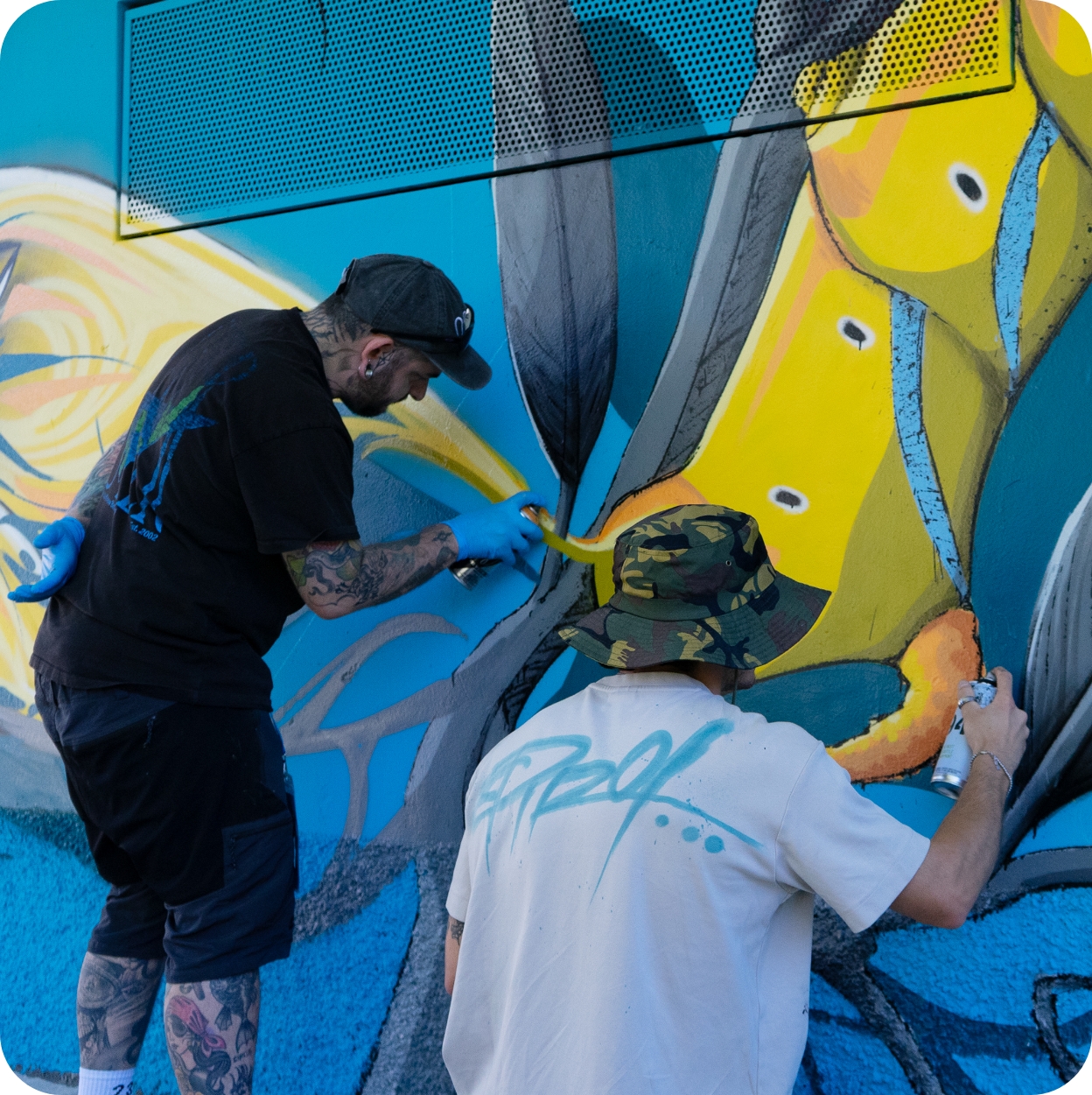 L’azzurro e il verde sono una scelta consapevole: colori legati alla natura, alla sostenibilità e alla rigenerazione. L’obiettivo è trasmettere una visione positiva della cultura street, come strumento per valorizzare e migliorare gli spazi urbani, lontano da ogni connotazione vandalica.